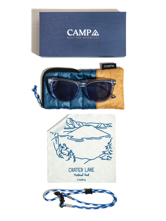 Part of our National Parks Collection, the Arrowcrest's "Lake" frame color is inspired by the landscapes of Crater Lake National Park. This limited edition package includes a custom sleeping bag travel case, microfiber cleaning cloth, and paracord eyewear retainer. Artwork for the collection was created by Portland, OR artist Emma Boys.