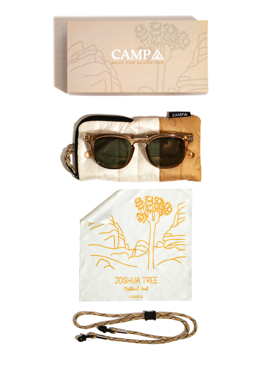 Part of our National Parks Collection, the Topo's "Desert" frame color is inspired by the landscapes of Joshua Tree National Park. This limited edition package includes a custom sleeping bag travel case, microfiber cleaning cloth, and paracord eyewear retainer. Artwork for the collection was created by Portland, OR artist Emma Boys.