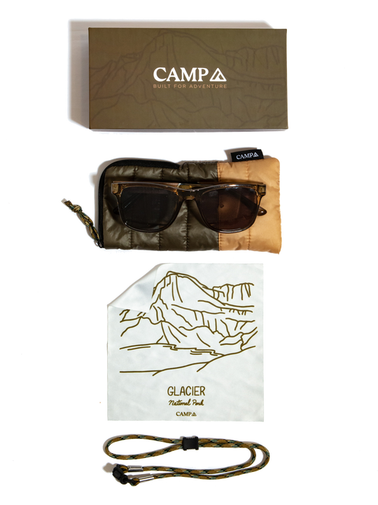 Part of our National Parks Collection, the Trail's "Moss" frame color is inspired by the landscapes of Glacier National Park. This limited edition package includes a custom sleeping bag travel case, microfiber cleaning cloth, and paracord eyewear retainer. Artwork for the collection was created by Portland, OR artist Emma Boys.